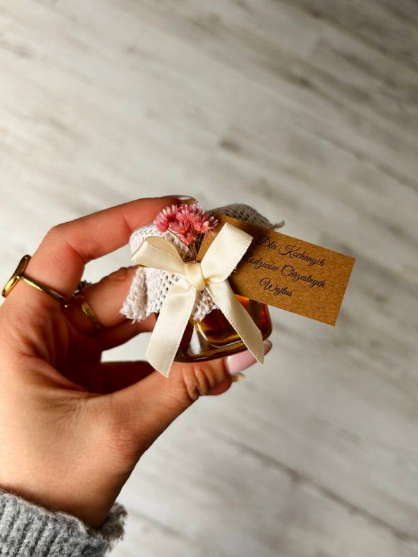 Cena obejmuje: słoiczek miodu, nakładkę z juty, zawieszkę personalizowaną oraz suszone kwiaty