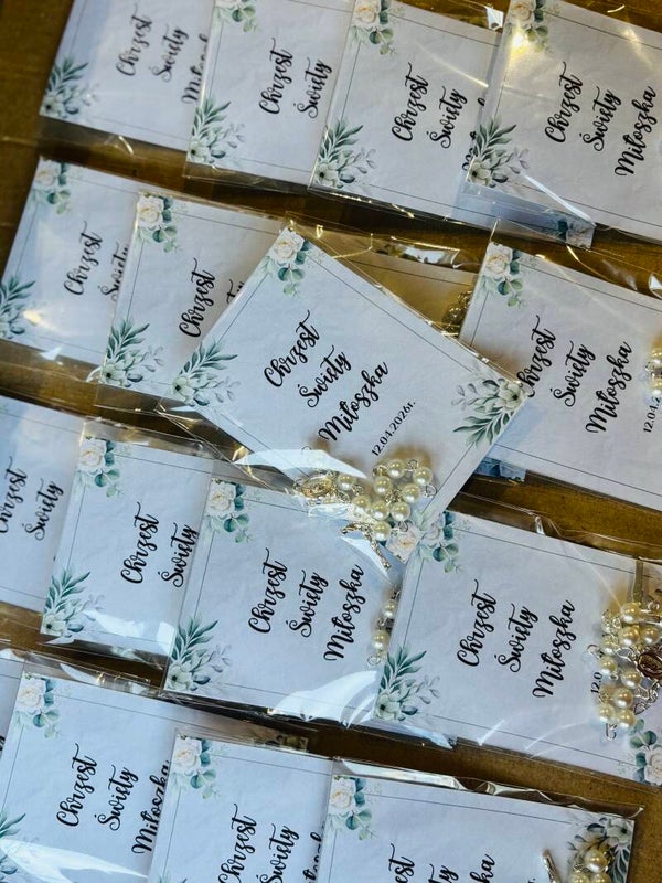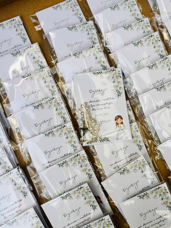 Różańce pakowane w celofan z karteczką z personalizowaną grafiką oraz tekstem.