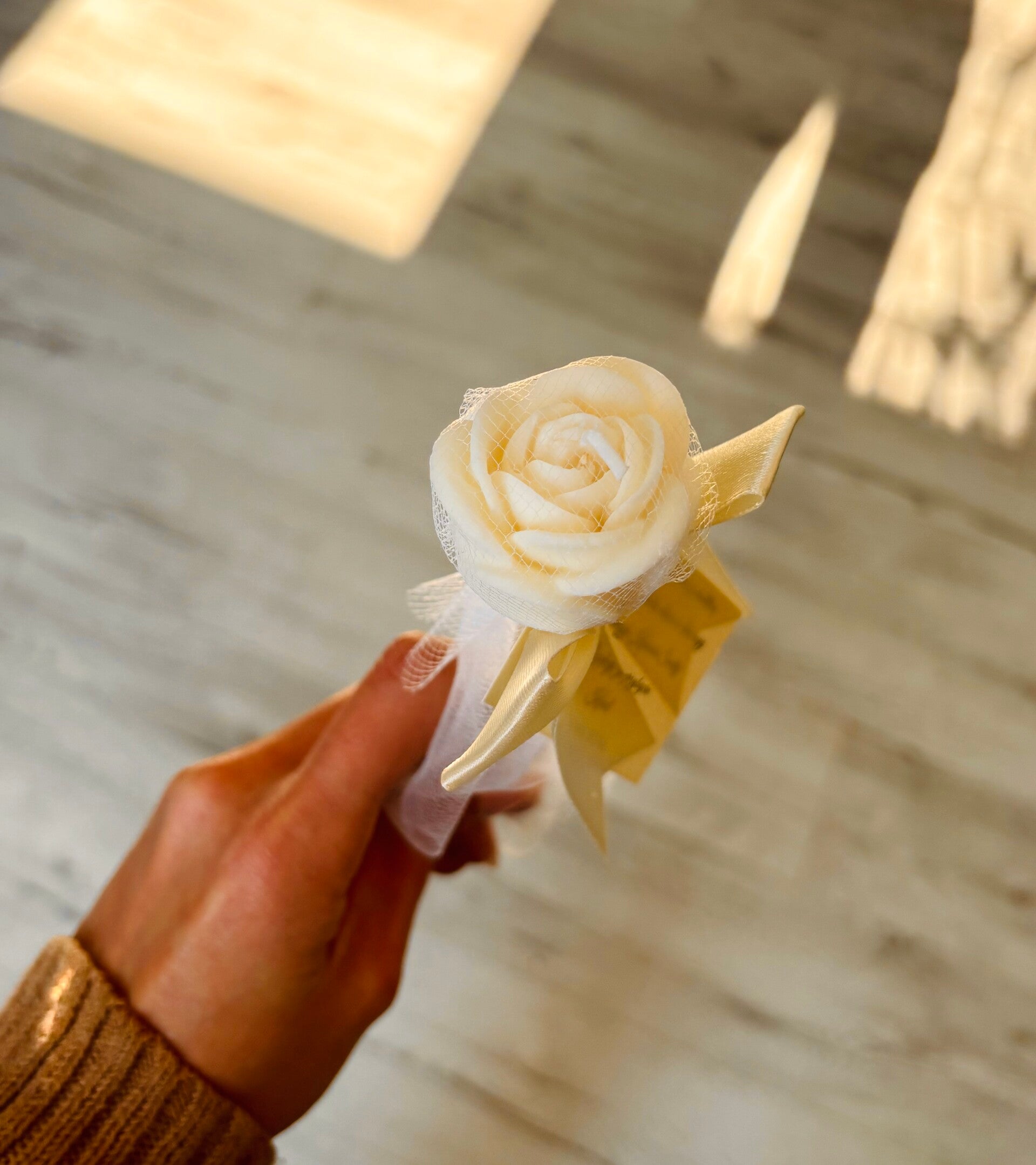 pakowane w tiul lub celofan wstążkę oraz personalizowaną zawieszkę