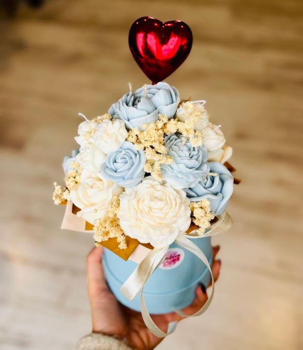 Flowerbox ze świec sojowych w kolorystyce błękitno kremowej. Różne rodzaje kwiatów o łącznej średnicy około 19 cm, wysokość 25 cm.