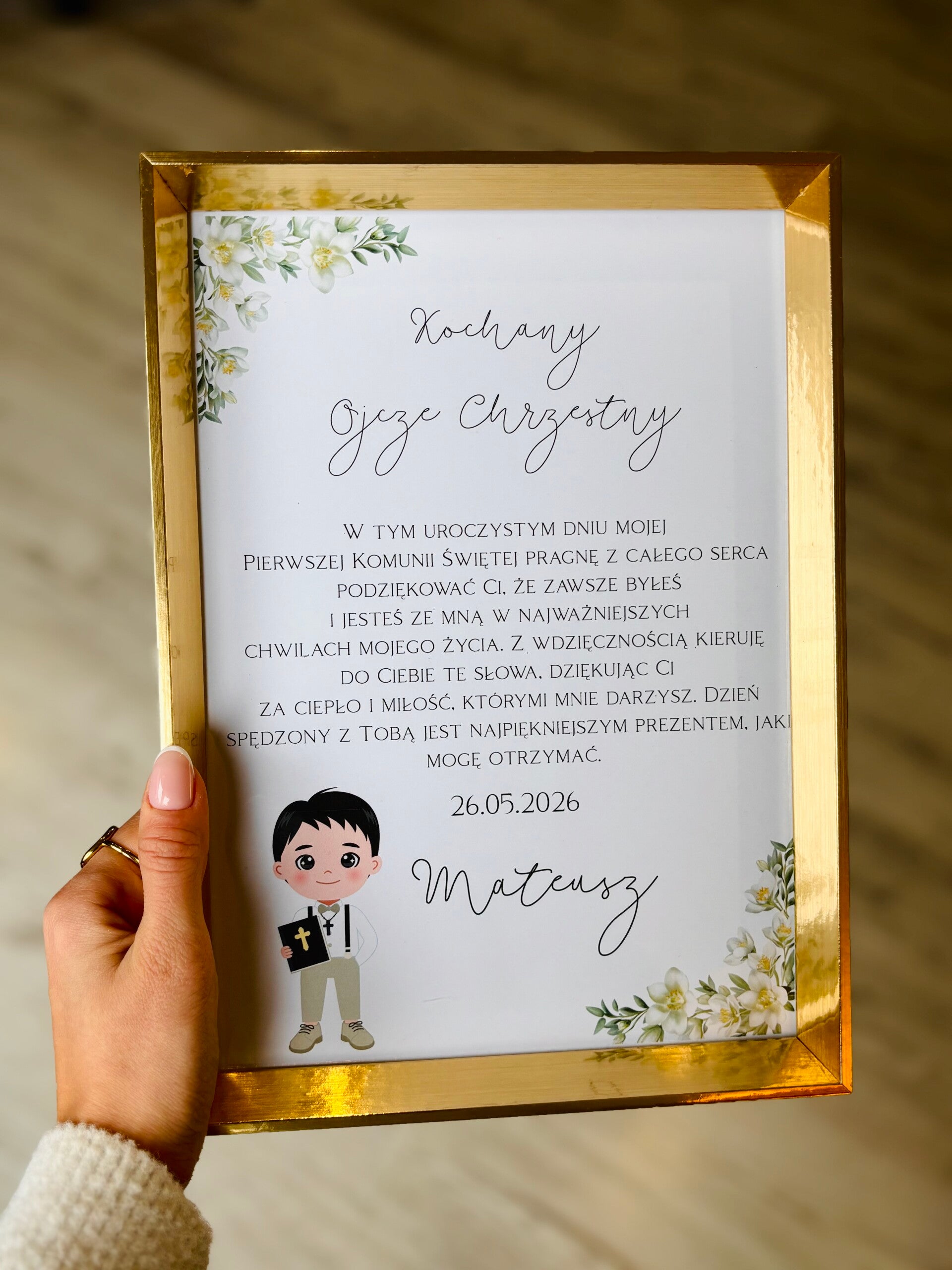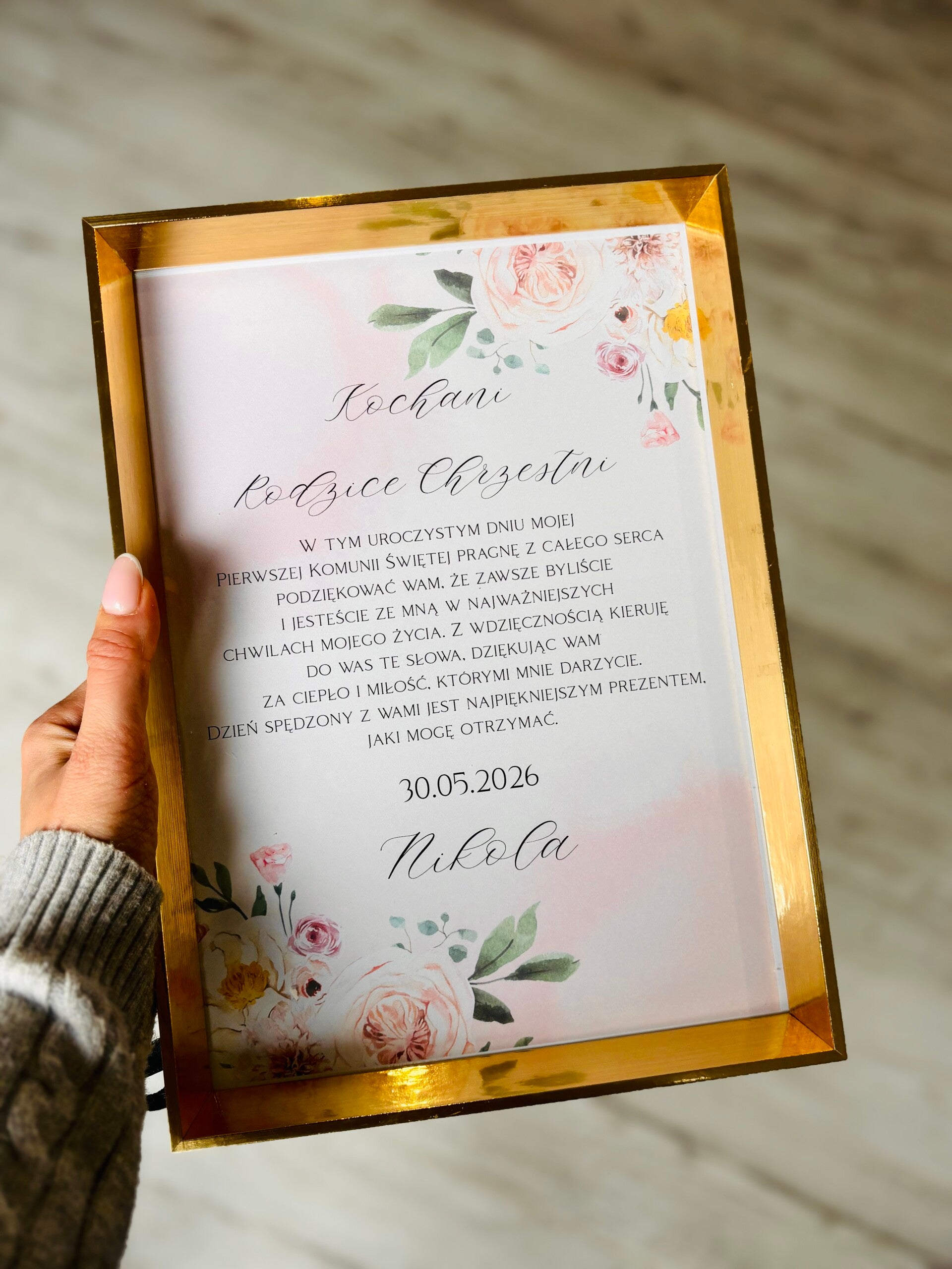 Personalizowane złote ramki z podziękowaniem - możliwość zawieszenia lub postawienia.