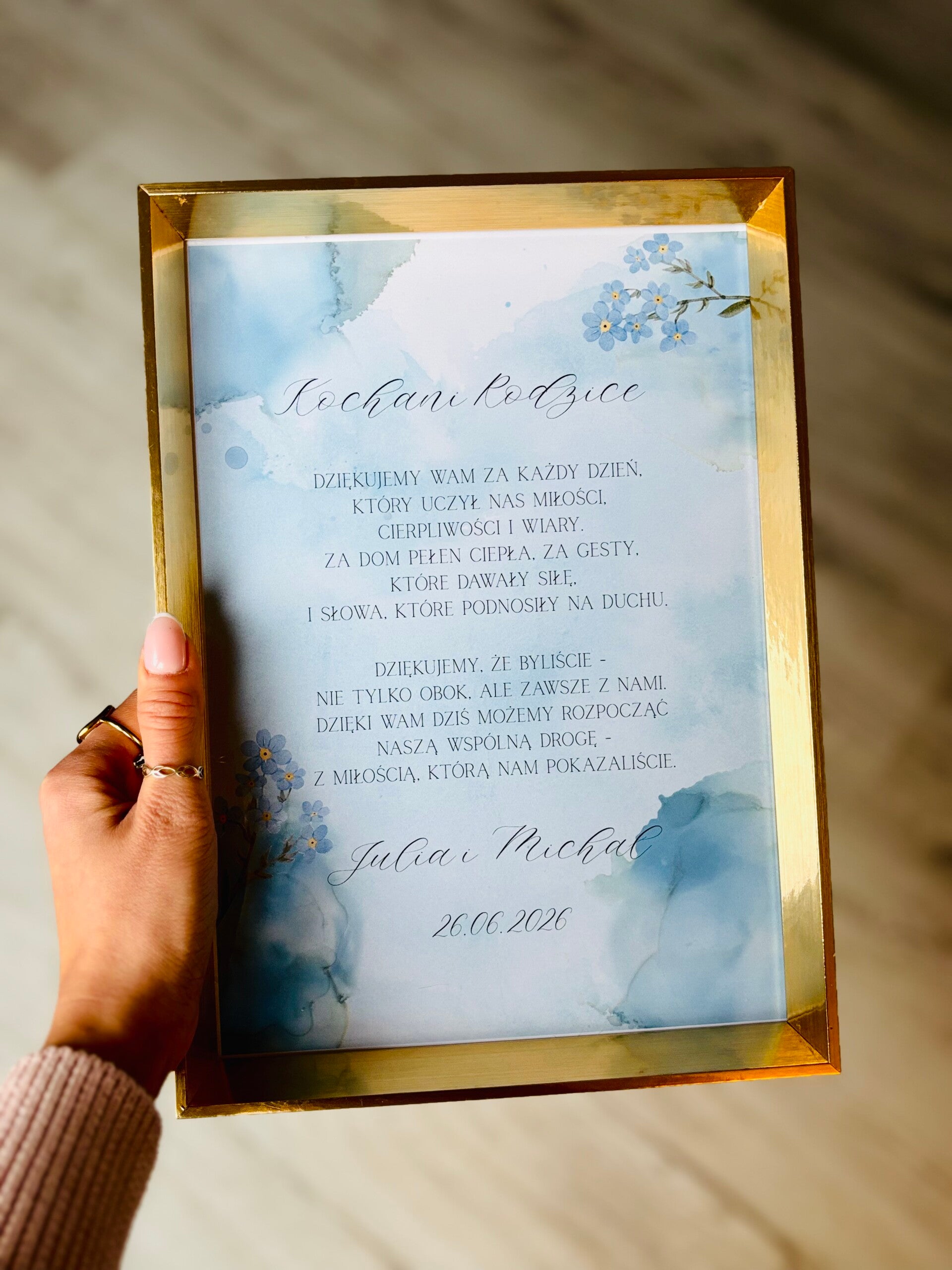 Personalizowane złote ramki z podziękowaniem - możliwość zawieszenia lub postawienia.