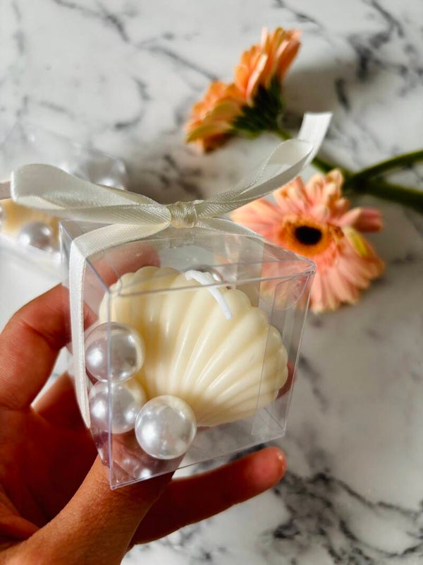 świeczki z perełkami pakowane w pudełko transparentne, wstążkę oraz personalizowaną zawieszkę
